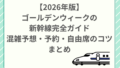 【結論】ゴールデンウィークの新幹線は「ピーク日を避ける・早めに予約・並び方を工夫」で快適に移動できます。GWは年間でもトップクラスの混雑期間ですが、事前にポイントを押さえることが大切です。この記事では、2026年の混雑予想、ピーク日、指定席...